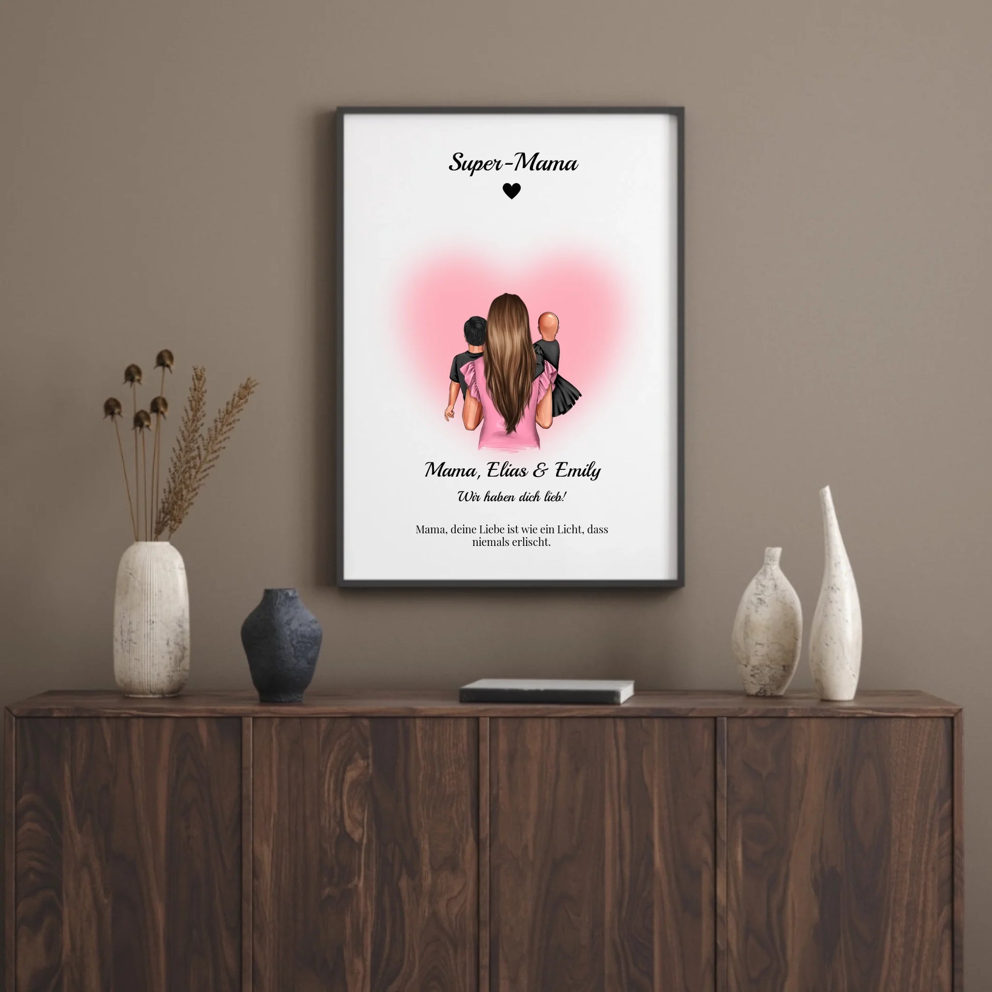 Egal ob blonde Locken, kurzer Bob oder Brille – gestalte die Figur so, dass sie deiner Mama zum Verwechseln ähnlich sieht! Füge bis zu zwei Kinder (ebenfalls personalisierbar) hinzu und ergänze ihre Namen. Ein Wandbild, das jeden Raum mit Power und Liebe füllt.