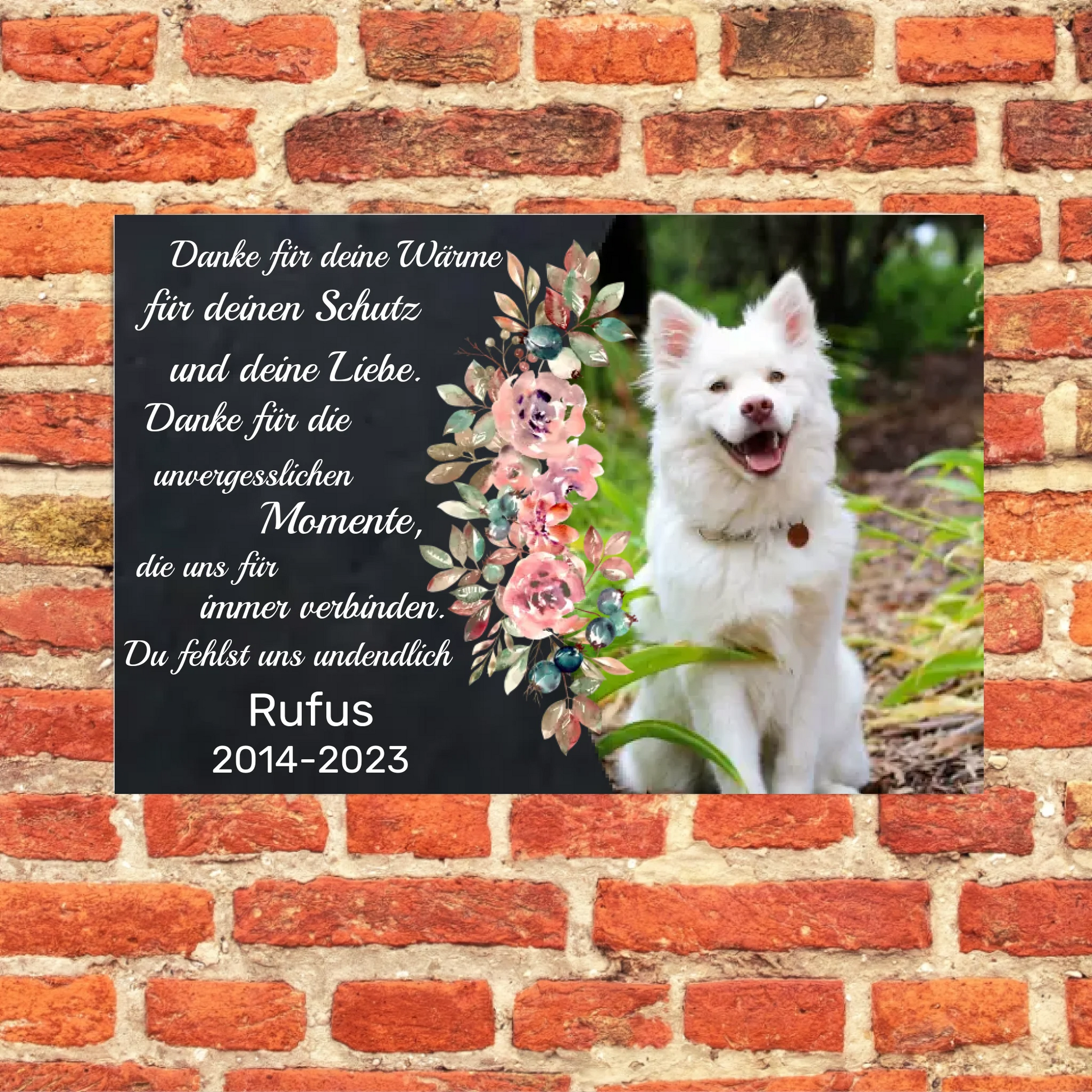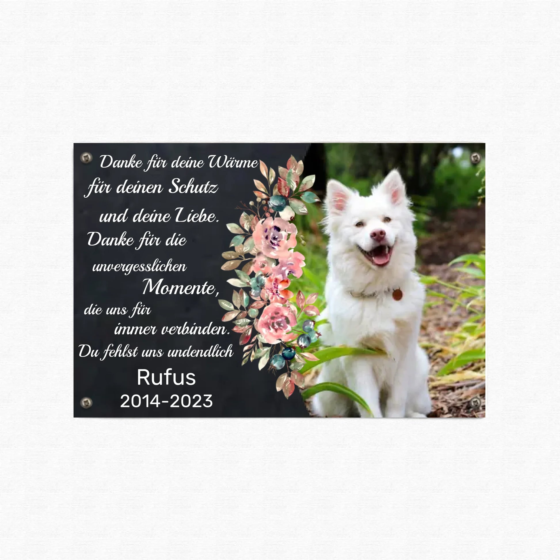 🌸 Schönes Design: Das Schild bietet nicht nur Platz für ein Foto Ihres Haustiers, sondern auch für einen individuellen Text und Datumsangaben, umrahmt von einem stilvollen floralen Design.