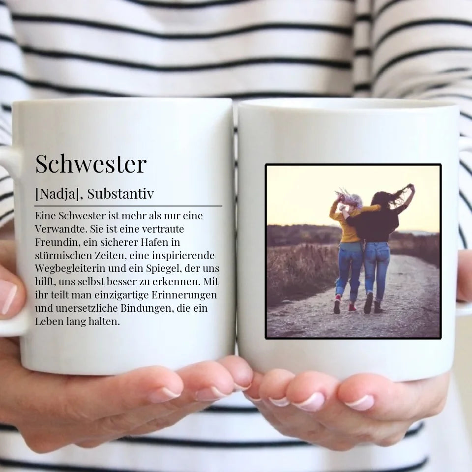 Unsere personalisierbare "Schwester Definition" Tasse ist das perfekte Geschenk, um Deiner Schwester Deine Liebe und Wertschätzung zu zeigen. Mit einer liebevollen Definition, einem persönlichen Bild und Deinem Wunschtext wird die Tasse zu einem einzigartigen Andenken an all die wundervollen Momente, die Ihr gemeinsam erlebt habt.